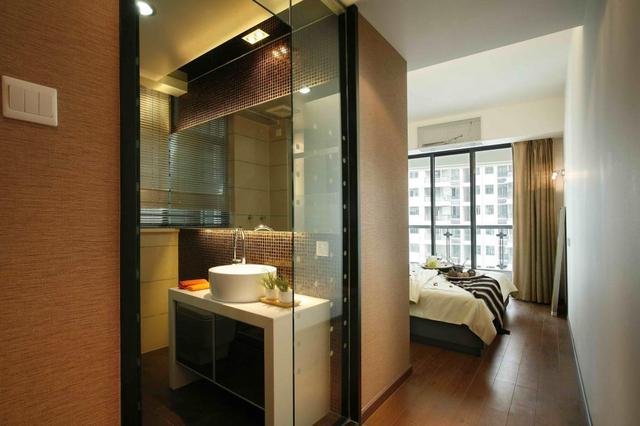 原本卧室卫生间门的位置,可以考虑用砖重新砌上,把它做得跟普通墙壁一样。也可以直接在这里安装一个玻璃,增强卫生间的采光——如果卫生间是暗卫,而且没有把新门开在卧室外的话,非常建议这样做。