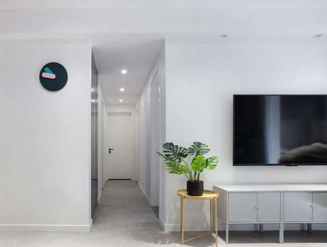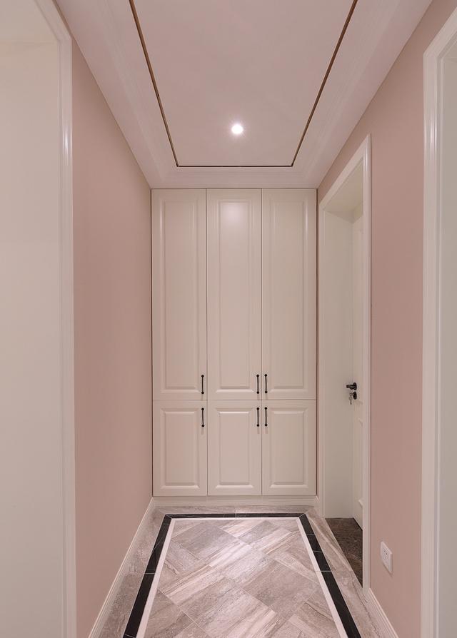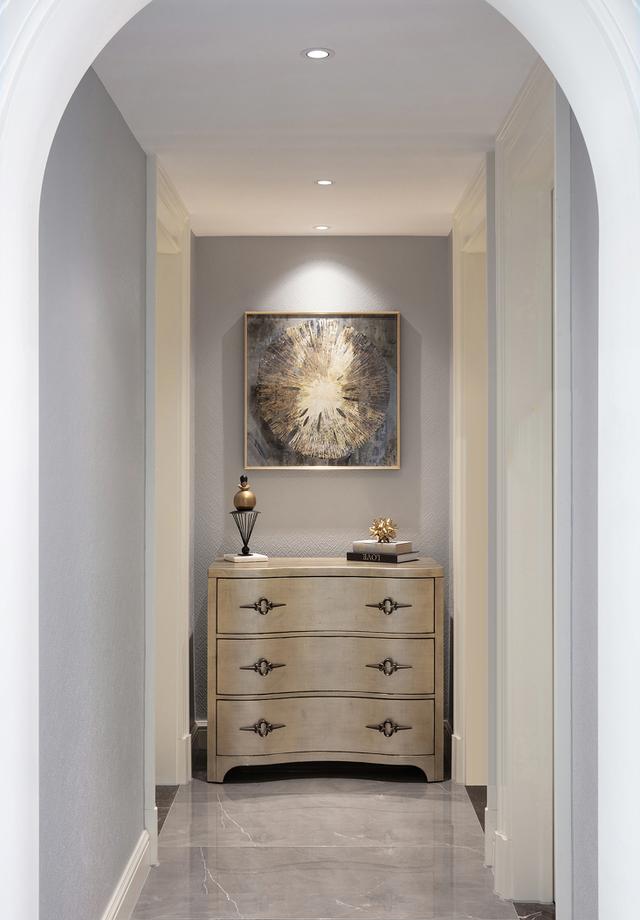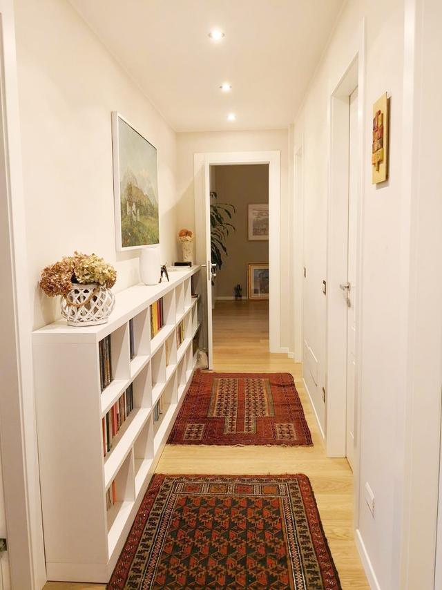 过道的尽头除了可以挂画以外,如果有空间的话,你还可以定制一个柜子,柜子的颜色尽量选浅色的,比如白色的柜子,视觉上也不会显得拥挤,同时又可以增加很多储物空间!