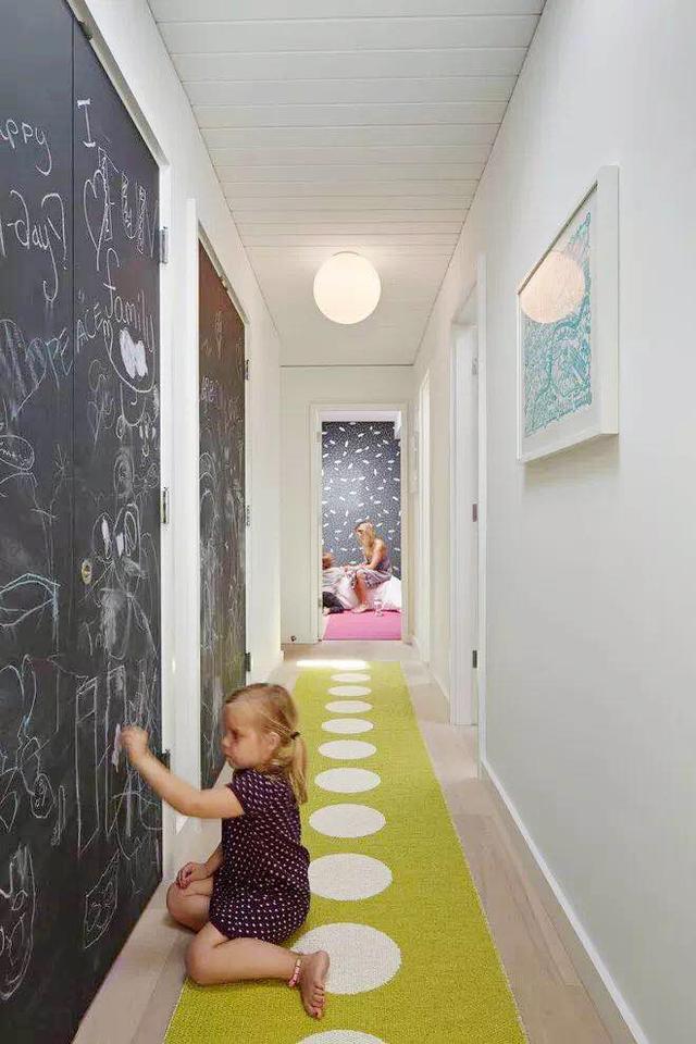 如果你家有小孩或者你自己很喜欢黑板墙的话,你可以在过道的墙面上刷一面黑板墙,这样小孩就有地方涂鸦了,现在有无尘粉笔,不用太担心粉笔灰这个问题,黑板漆价格也不贵,一面黑板墙几百块到一千多就可以搞掂了,关键看你刷多大面积的黑板墙。