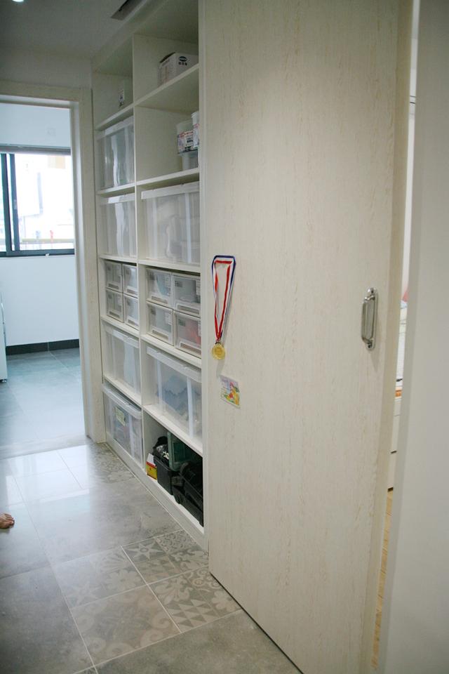如果你家过道的墙是非承重墙的话,还可以把这面墙拆了,做了一个内嵌的柜子,不过这面墙能不能拆,你还是要问专业人士搞清楚,如果是承重墙就不能拆了,这种内嵌柜子比较节省空间,条件允许的情况下,可以考虑这种设计。