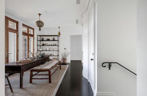 客厅一侧便是餐厅,白色的墙壁配上实木的地板和家具,很有种传统家居设计的平和感。