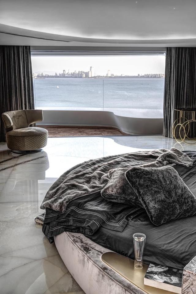 在主卧室是完全专注于无与伦比的景色之外的宏伟空间。床是房间中的焦点,床的方向应使其与电视成一个角度且与另一个窗口相对。在这间卧室的设计中,空间被完全重组为圆形,而没有通常定义的方形房间,大理石地板强调了这一点,周围环绕着环形镶嵌物。房间完全面向豪华和舒适环境,一侧设有座椅,搁板空间,内置床头柜和辅助床头柜。一侧的弧形墙具有填充和簇绒的几何设计,增加了柔和的触感并有助于吸收更多声音。