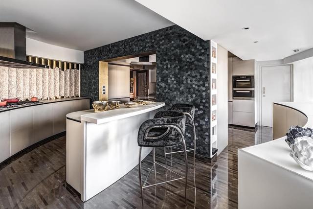 厨房的形状像一个开放的胶囊,其弯曲的柜台围绕着由磨砂玻璃制成的弧形中央岛。调色板将白色橱柜和柜台与灰色阴影的图案墙和大理石条纹地板相结合。当然,厨房配备了所有需要的最先进的设备,所有设备都被精心隐藏起来,直到需要使用为止。沿着柜台,Koket的Charla Dining Chair吧椅版本采用了灰色纺织面料,与墙壁相协调,并在空间中提供了柔软的质感。