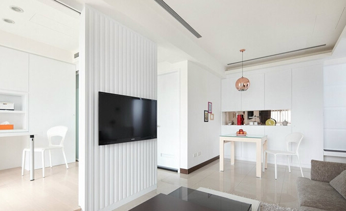 白色的空间,本身就让客厅加倍放大。而隔断的设计不止是将其与过道隔开,更是为客厅区域增添书房、制造电视背景墙,小小隔断的设计,威力巨大。