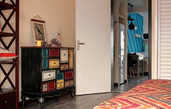 卧室的多彩柜与床和墙纸颜色相配,主卧空间立马沉静了下来。