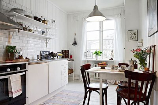 新古典风格厨房装修效果图:雪白的空间带给人一种焕然一新的感觉,白天下厨时的光线也很足,内设温馨小餐桌。