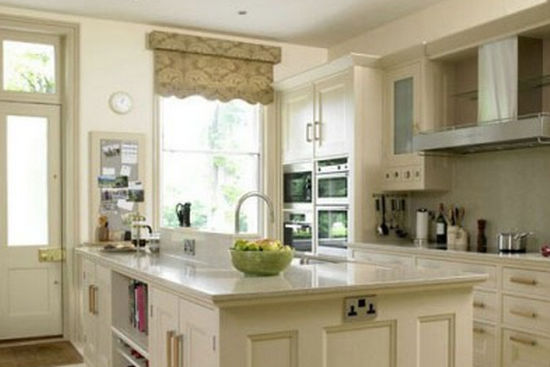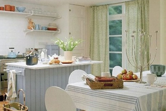 新古典风格厨房装修效果图: 休闲下厨的同时还能欣赏一番外面的自然风景,不免别有一番情趣。用新古典风格的厨房装修,享受休闲下厨的好心情。