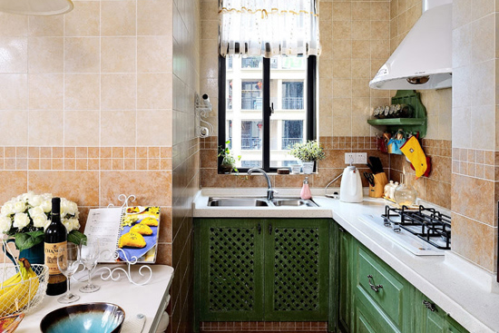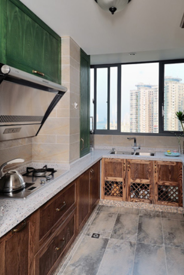新古典风格厨房装修效果图:棕色搭配绿色使人更提神,狭小的空间也不忘营造自然的气息。