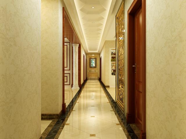 矩形走廊一直是大户型经常遇到的问题之一,此处空间设计合理利用吊顶以及地面造型以及灯光的晕染将空间的深度压缩宽度拉宽。
