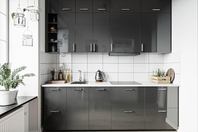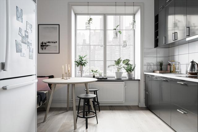 丰富的绿色植物提升了灰色和白色的一面墙厨房的外观。