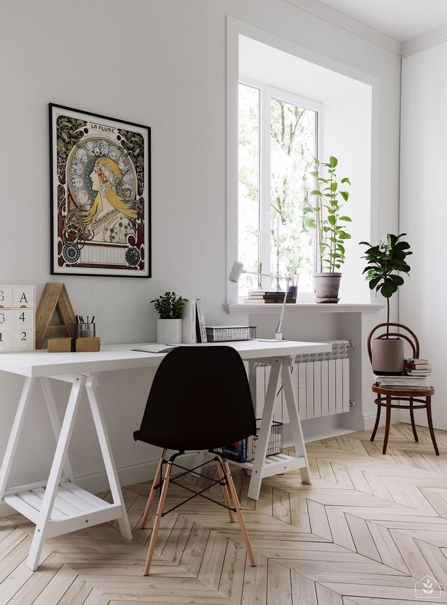 卧室对面摆着一张家庭办公桌,上面装饰着一幅La plume海报,还有几株室内植物作为陪伴。