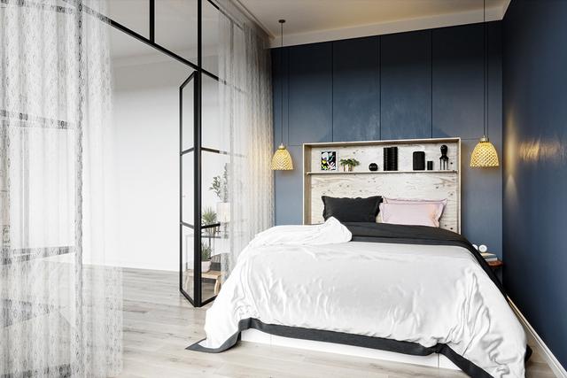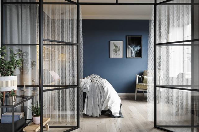 在清晰的体积内,蓝色的卧室方案拥有舒适温馨的外观。蕾丝纱线柔化了玻璃隔断的视觉效果。