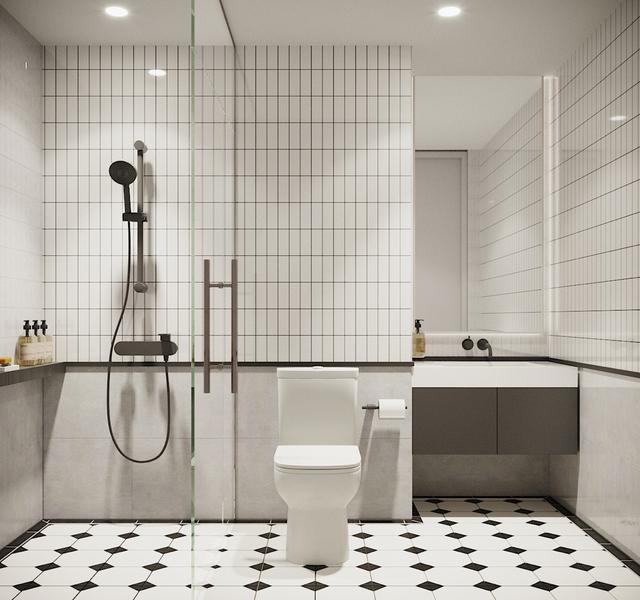 熟悉的黑白地板在浴室中也出现了,不过在这里的方案是严格的单色,提供了绿色口音的停顿。