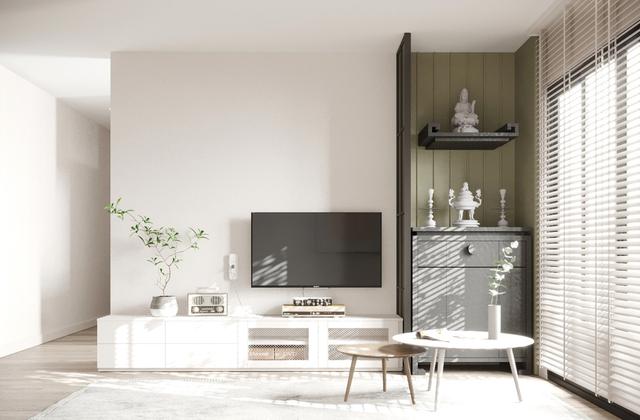 客厅里的白色区域地毯上摆放着木质和白色嵌套咖啡桌。一个媒体柜在一台壁挂式电视上轻轻地加了一层阴影。电视墙的一端已被屏蔽,以绿色背景为背景,展示禅宗风格的物品。
