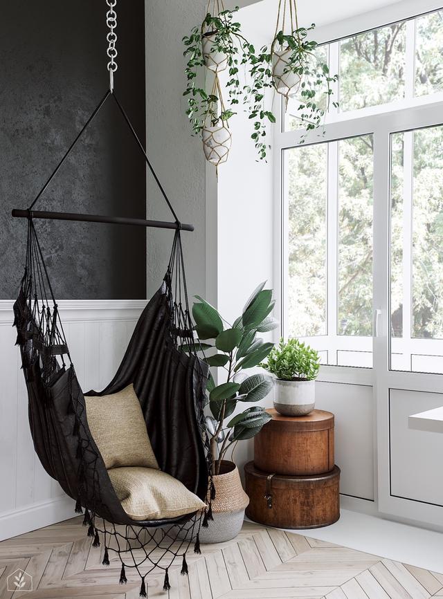 在家庭办公区域的一侧,有一个轻松的秋千座位,可供您沉思或阅读。