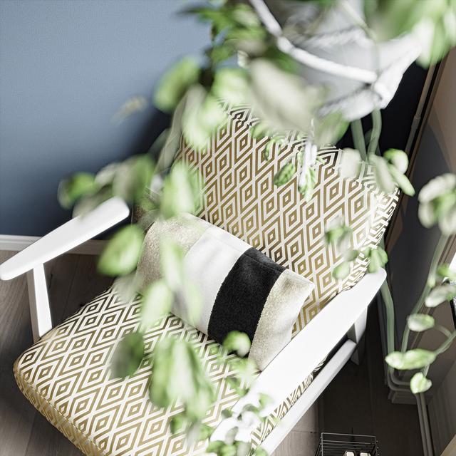 一张舒适的阅读椅由白色和金色的几何布料制成,在窗户的光线下反射效果。白色的油漆在一张小边桌的腿上停了下来,显露出温暖的木质色调。