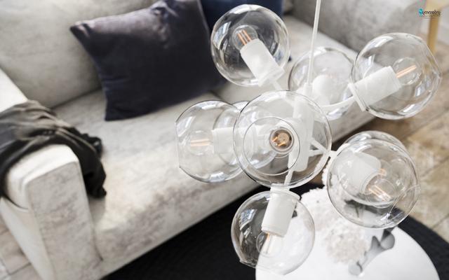 一个人造卫星吊灯低垂在休息室茶几,玻璃球色调闪闪发光。