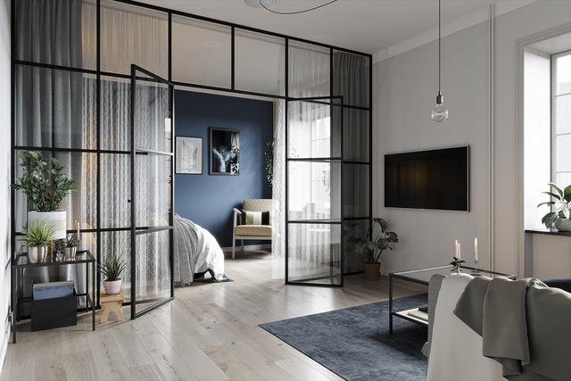 客厅沙发面向玻璃墙卧室,可通过双门进入。