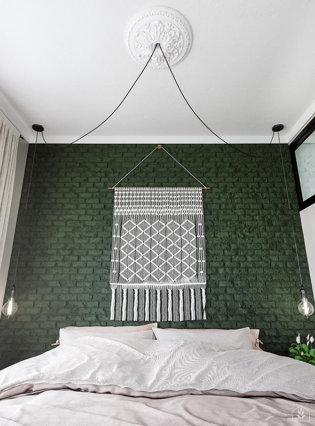 在极简主义的卧室里,有一个宽阔的绿色床头板设计,也跨越了家庭办公区后面的空间。