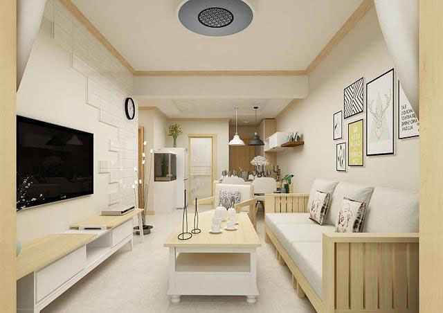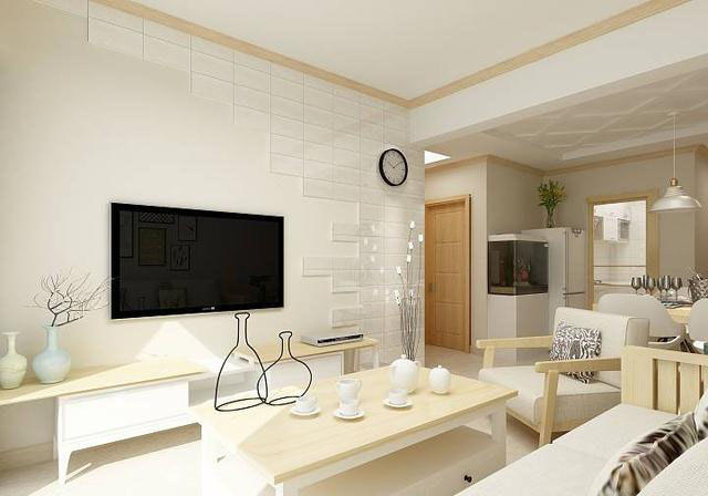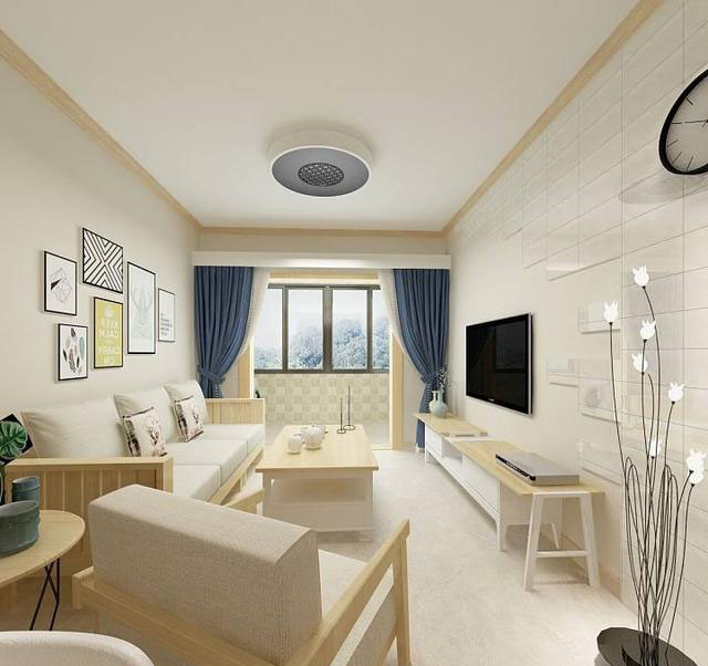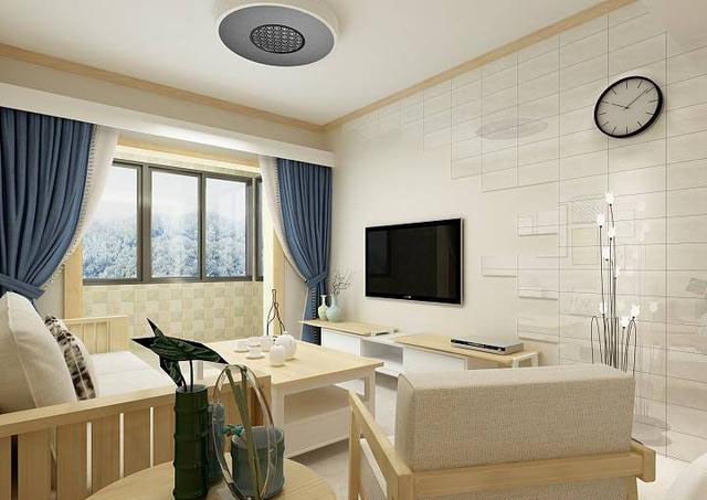 武汉家装公司:整个原木色系的空间使用蓝色窗帘拉开层次感,柔和而时尚。错落式电视墙增加了空间的整体跳跃感,让空间不再单调。以简洁的表现形式来满足人们对空间环境感性和理性的需求,简洁明快,以少胜多,以简胜繁。
