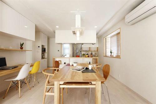 厨房外面是饭厅,原木打造的餐桌餐椅和全屋的风格十分配衬。饭厅一旁是一个小型工作间,可以作为电脑角,饭前阅览一下新闻,播放音乐,设计方便实用。