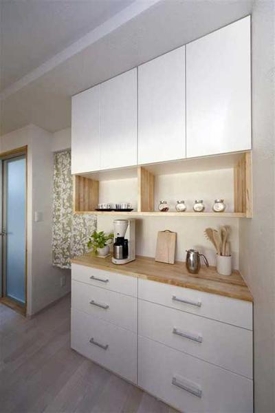 厨房内还有一个多功能餐柜,可以收纳厨房物料、食材及厨具等,非常实用。你也可以根据你们家厨房的布局来设计打造一个适合的餐柜哦!