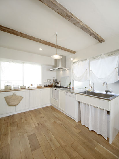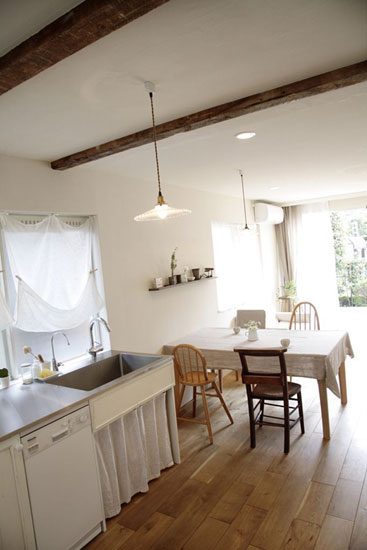 装饰Tips:厨房的另外一角,金属色彩的水池,规整的样式,可见日本人对生活的严谨态度。白色的布帘、窗帘,可以折叠的样式,增添了厨房区域的动感。长方形的木质餐桌,铺上一层麻色的桌布,不仅可以遮挡灰尘,而且也给餐桌增添了浓郁的日式淳朴之风。木质的椅子,造型布艺,活泼可爱,可见一家人幸福温馨的生活。墙壁上,木板打造的小展架,摆放上一些小的装饰品,可爱的样式,将餐桌处装饰的更具田园之风。再搭配几株绿叶植物,更显自然之感。