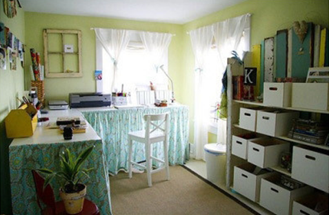 客厅中L性的桌子布局让工作更加方便,也有利于腾出中间的空间。一排柜子让多余物品得以收纳。