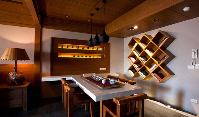 降低桌椅强调低矮的水平线,低高度的坐姿与视觉,不仅使身心安顿下来,且后方菱形书架也能完整呈现。