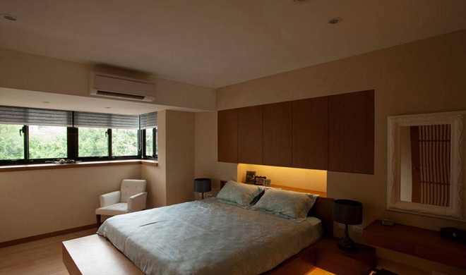 卧室继续使用木制家具。灯光点缀了清幽的气氛。