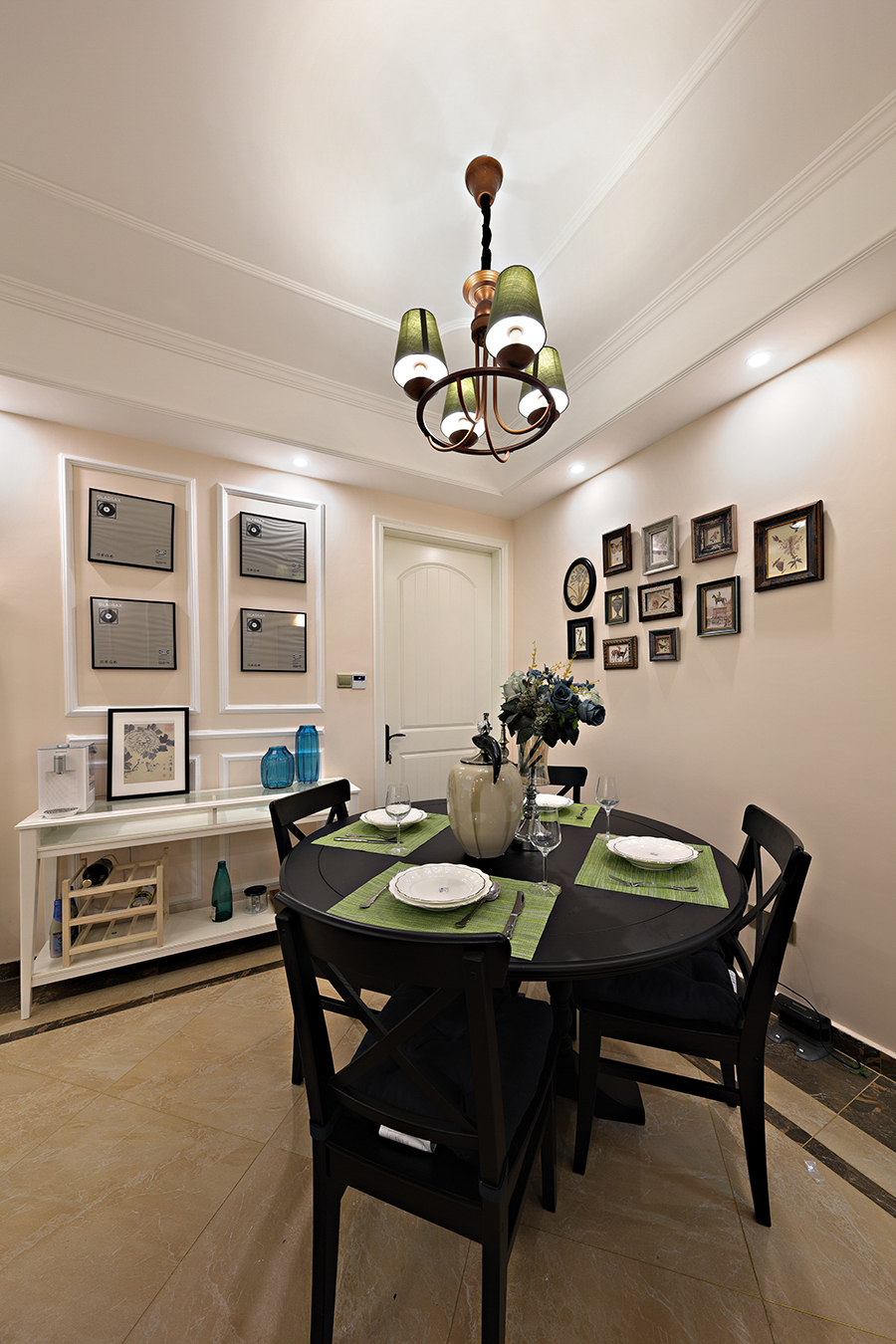 客厅的墙面设计给人带来清爽明快之感,黑白的线条延伸了整个空间,设计师在画框色彩的选择上偏向浑然一体并不突兀,将整个空间呢美感瞬间打造出来了。设计师选择舒适、柔性、温馨的材质组合,建立起一种温情暖意的家庭氛围,墙面上充满格调的画框装饰和造型独特的水壶显示着倪先生不凡的生活品味,柔美和温馨并集,优雅和自然交织充斥着美好的生活。简约造型的吊灯和餐桌椅融合客厅角落的优越因子及层次美感。桌子上的玻璃杯在灯光的照射下纹理沟缝更加清晰,绿色和暖黄的配色,瞬间活跃了空间的神情,令人食欲大开。