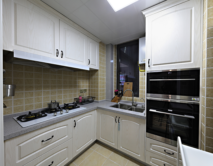 厨房不是很大,简单清爽,功能齐全,每一个小角落都有充分利用起来。收纳型的厨房给王女士带来很大的便利,格纹瓷砖搭配黑白色橱柜缓和了厨房浓重的油烟味。